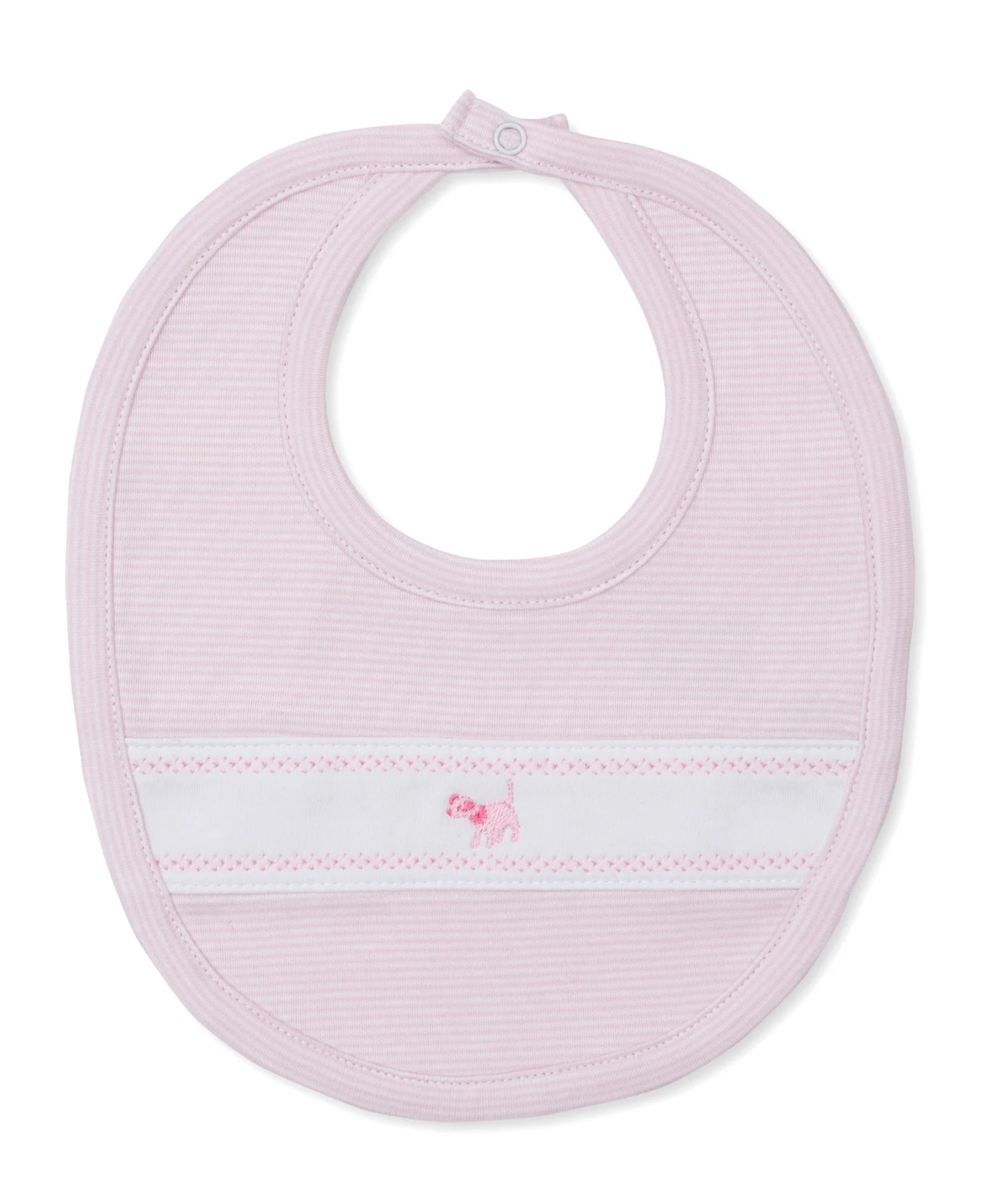 The allover pink striped bib by Kissy Kissy featuring little puppy embellishments is perfect for catching your baby's mealtime messes. Made from 100% Pima cotton for softness and comfort.