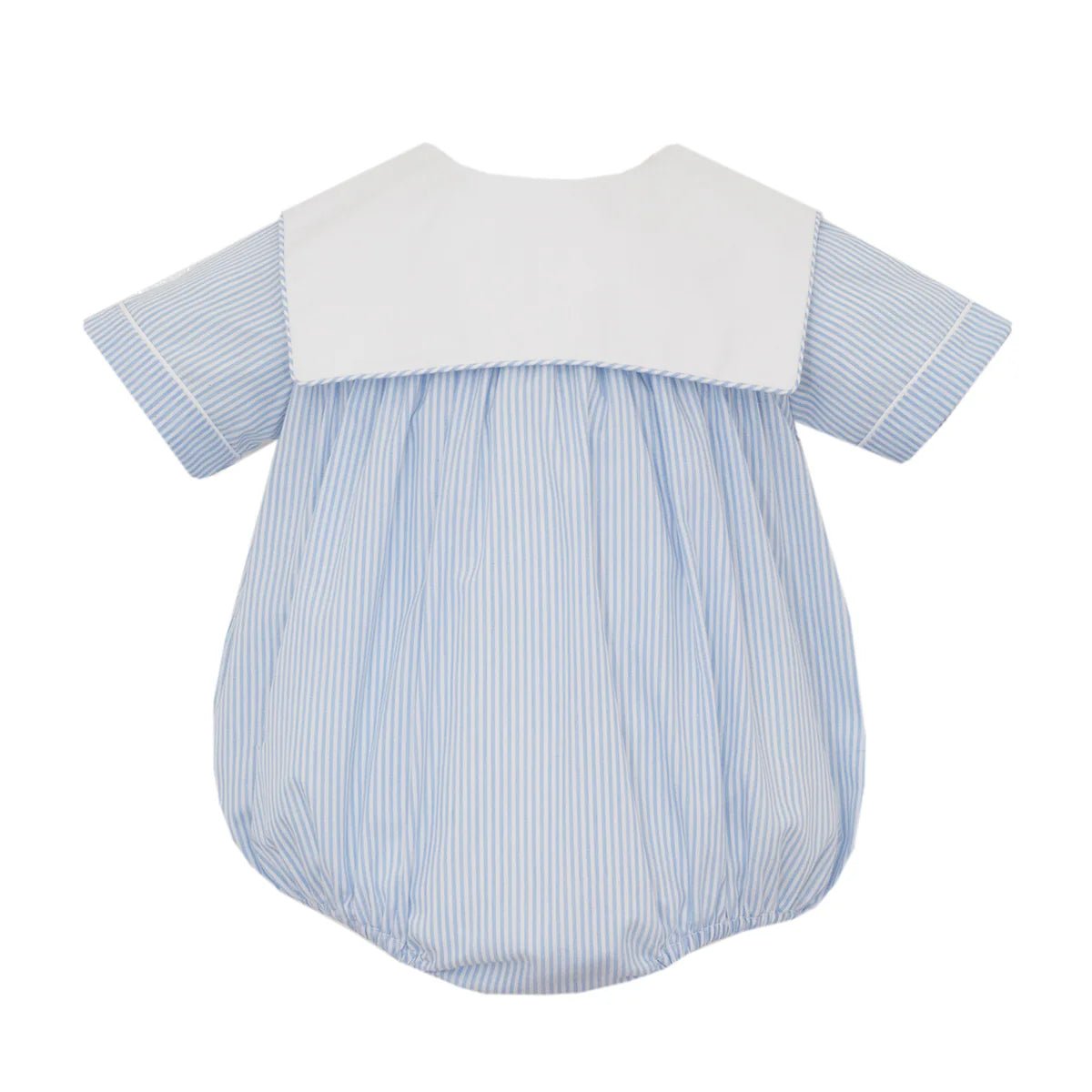 Petit Bebe Light Blue Stripe Bubble with White Square Collar - 12M is backordered and will ship as soon as it is back in stock.