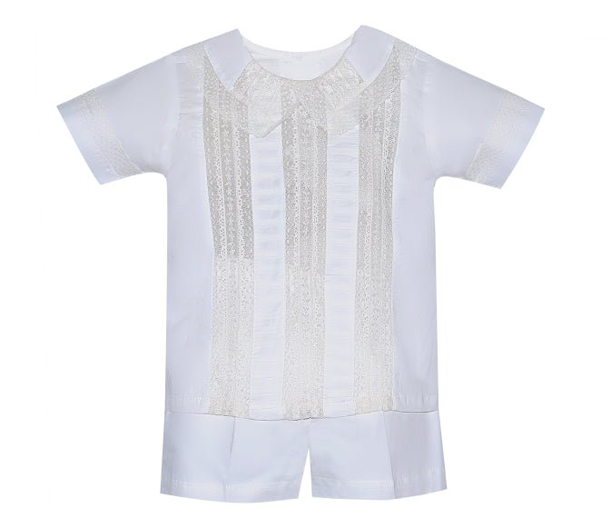 The White Rowan Short Set by Phoenix and Ren is a timeless baby boy outfit. Featuring exquisite lace and ribbon detailing, this set is that perfect heirloom piece for your little one.