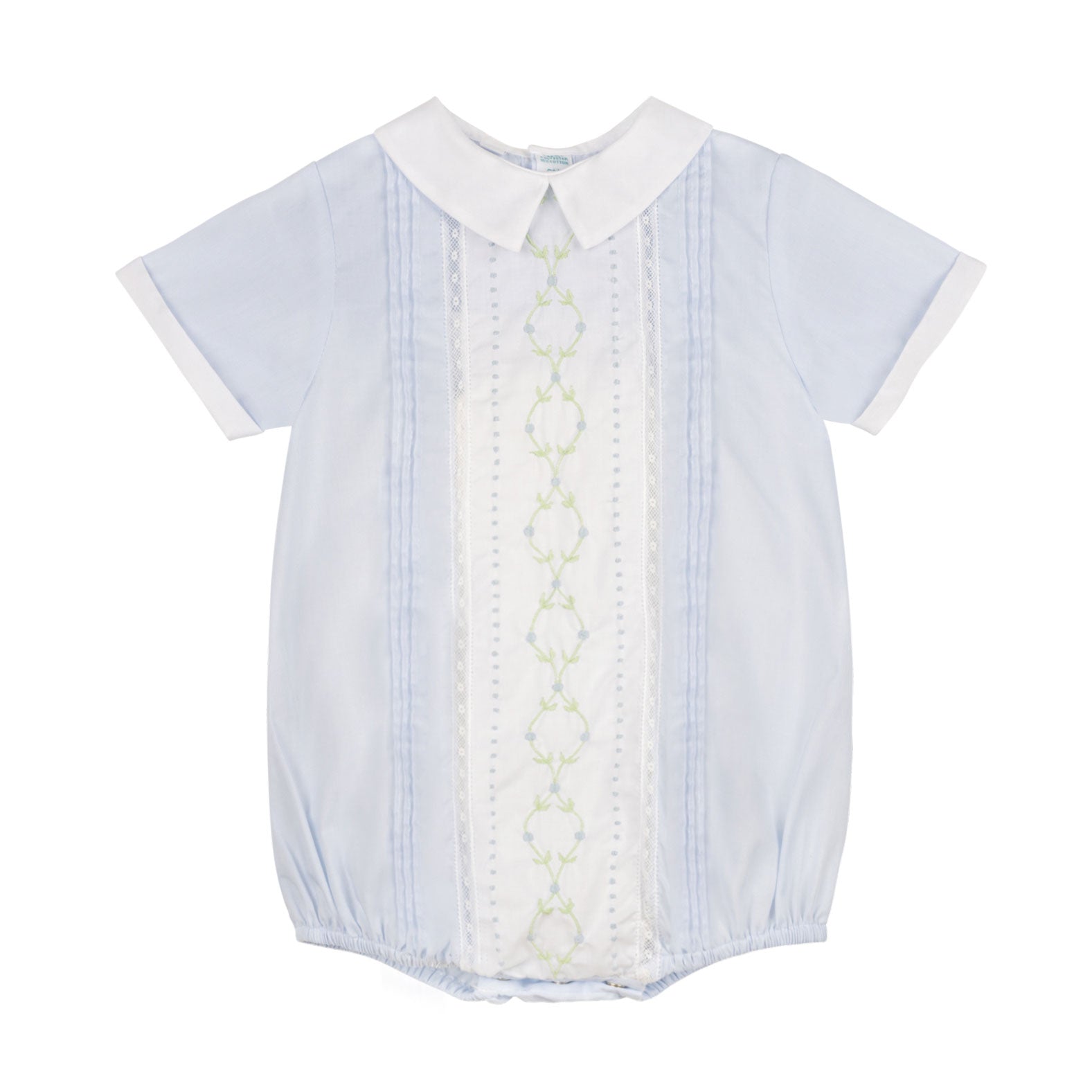 A truly timeless baby boy outfit by Feltman Brothers. The Vintage Bloom Romper features hand-stitched embroidery, lace, and pintucks. This romper is that perfect heirloom piece for your little one.