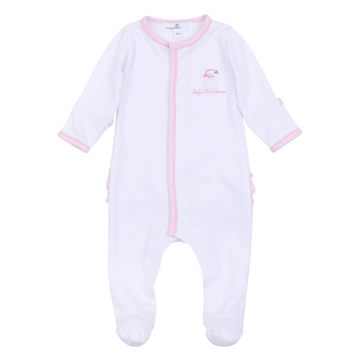 Magnolia Baby Santa Baby First Christmas Ruffle Footie - 3M is backordered and will ship as soon as it is back in stock.