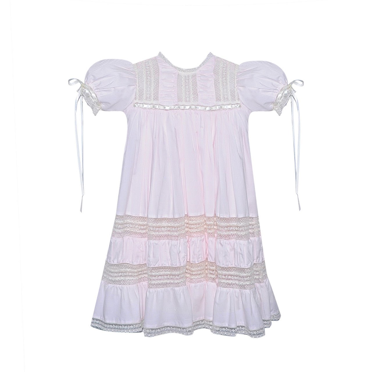 The pink Mary Claire Dress by Phoenix and Ren is a timeless heirloom piece.  Made from soft fabric adorned with lace and satin ribbon, your little girl will look like an angel.