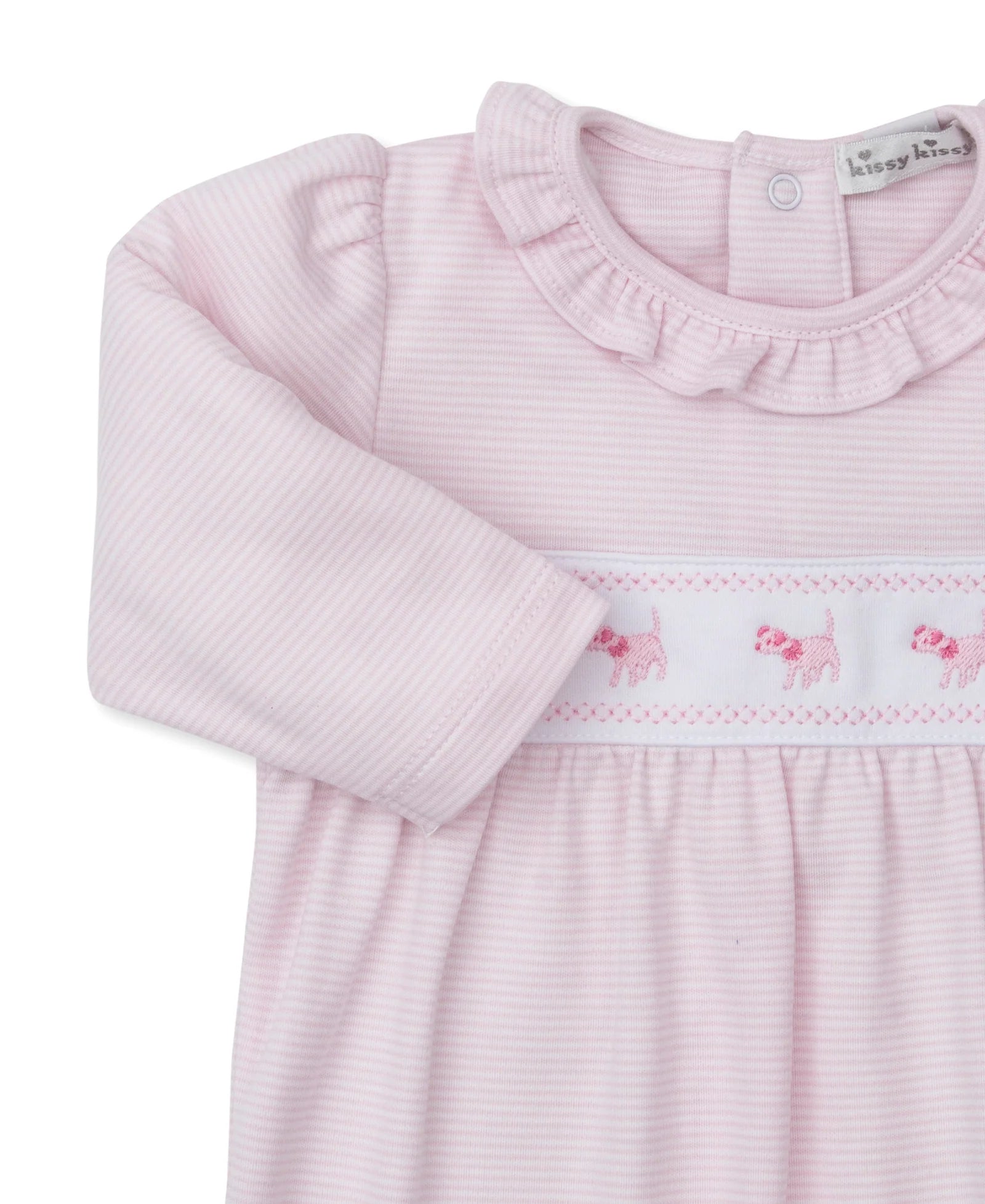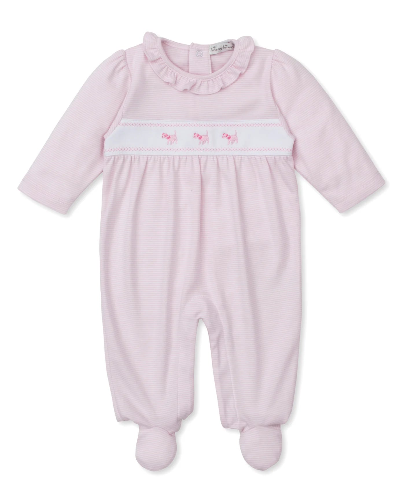 The Classic Treasures FA25 pink stripe playsuit by Kissy Kissy is the most precious playsuit for your baby. Made from the softest Pima cotton for ultimate comfort and featuring little puppy embellishments that she is sure to love!