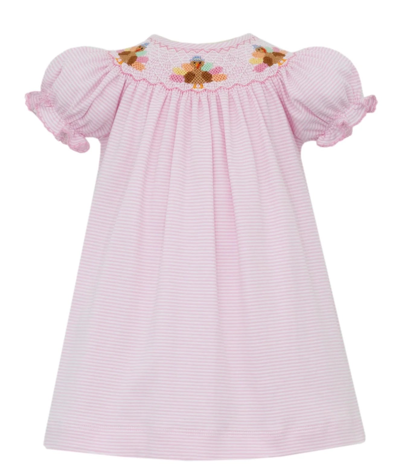 Get ready for fall in the Turkey Pink Stripe Knit Bishop Dress by Petit Bebe. Three smocked turkeys adorn this soft knit dress.