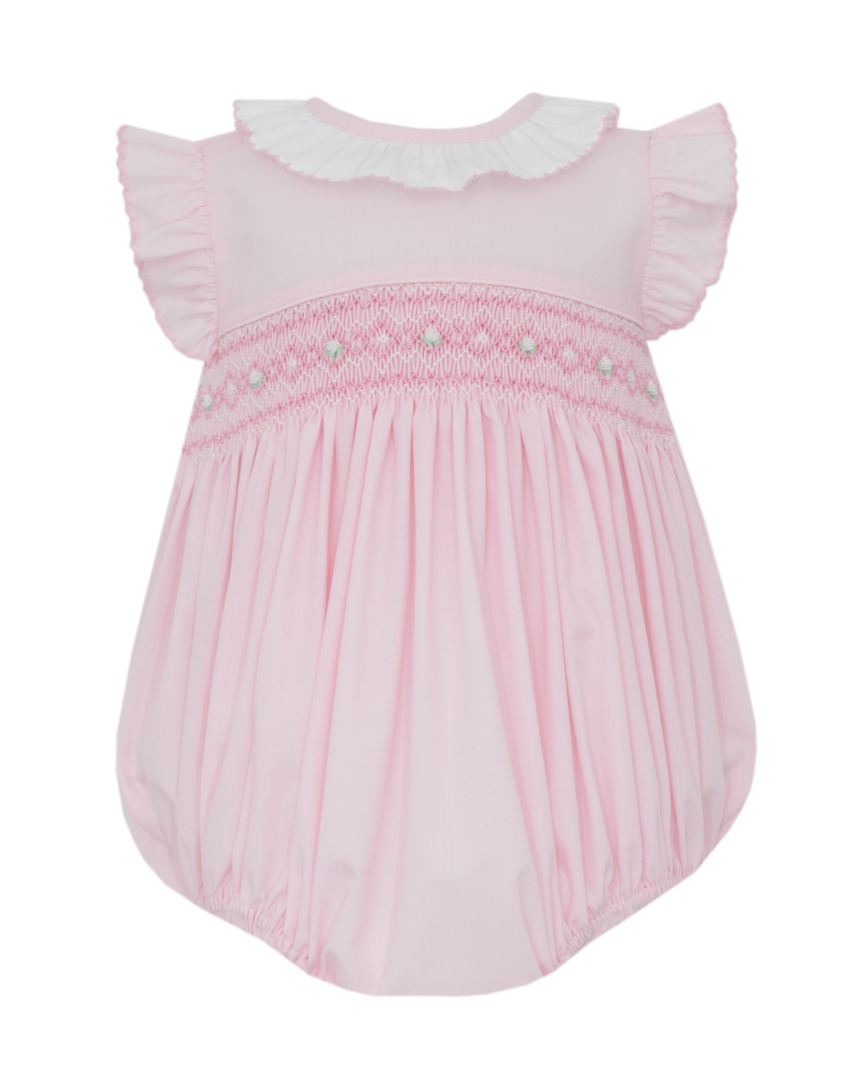 Petit Bebe Mila Pink Poplin Sleeveless Bubble with White Ruffle - 3M is backordered and will ship as soon as it is back in stock.