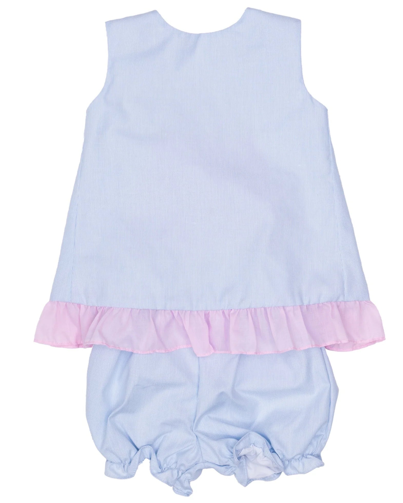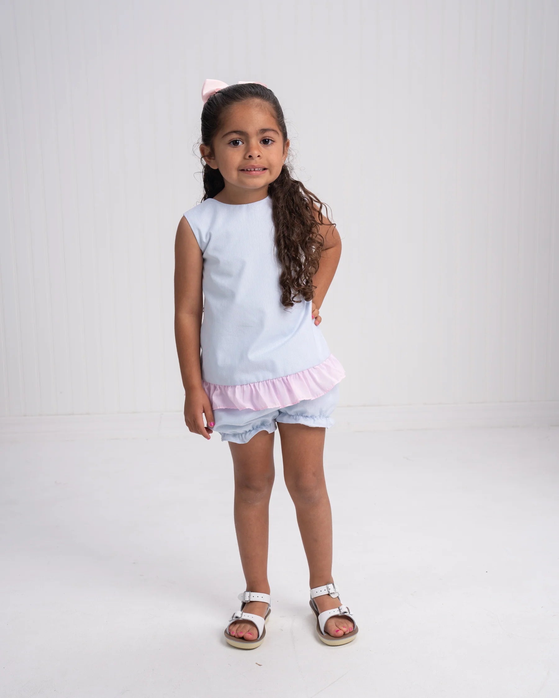 The Blakely Summer Blues Tie Back Set by The Oaks Apparel is perfect for warm weather. The crisp pale blue bloomer set with light pink ruffles meets effortless spring style all tied up with a bow.