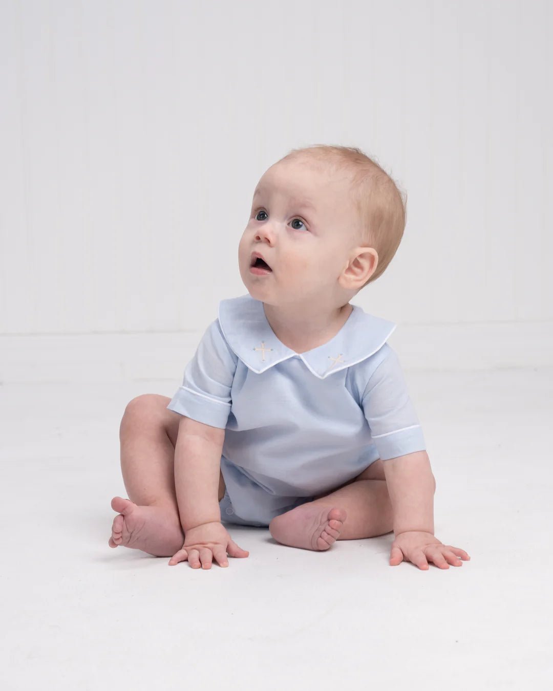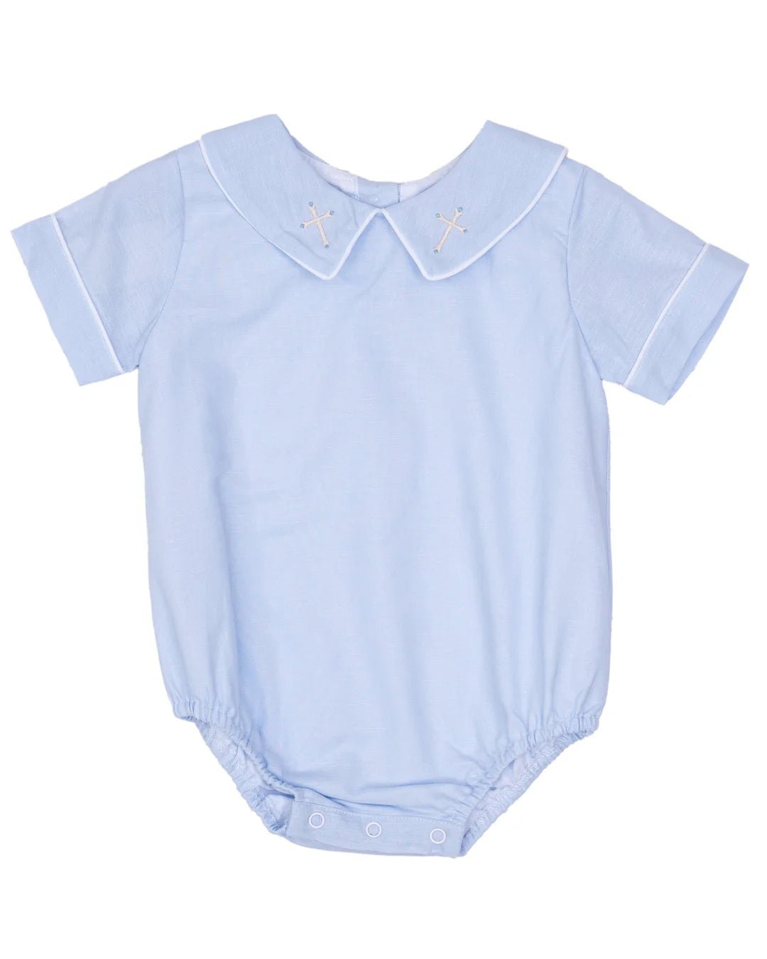 Timeless meet contemporary ease in this spring essential by The Oaks Apparel. The James Spring Cross Bubble features a crisp blue in a relaxed bubble with embroidered crosses on the collar.