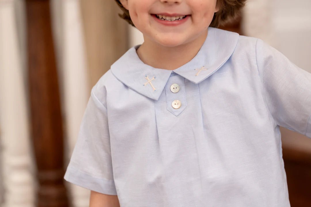 Perfect for any Spring or Summer occasion, the Joseph Blue Linen Short Set by The Oaks Apparel will be the star of the show! A soft blue short set features embroidered crosses on the collar.
