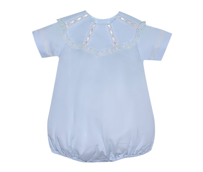 The Blue Maxwell Bubble by Phoenix and Ren is a timeless baby outfit. Featuring exquisite lace and ribbon detailing, this romper is that perfect heirloom piece for your little one.